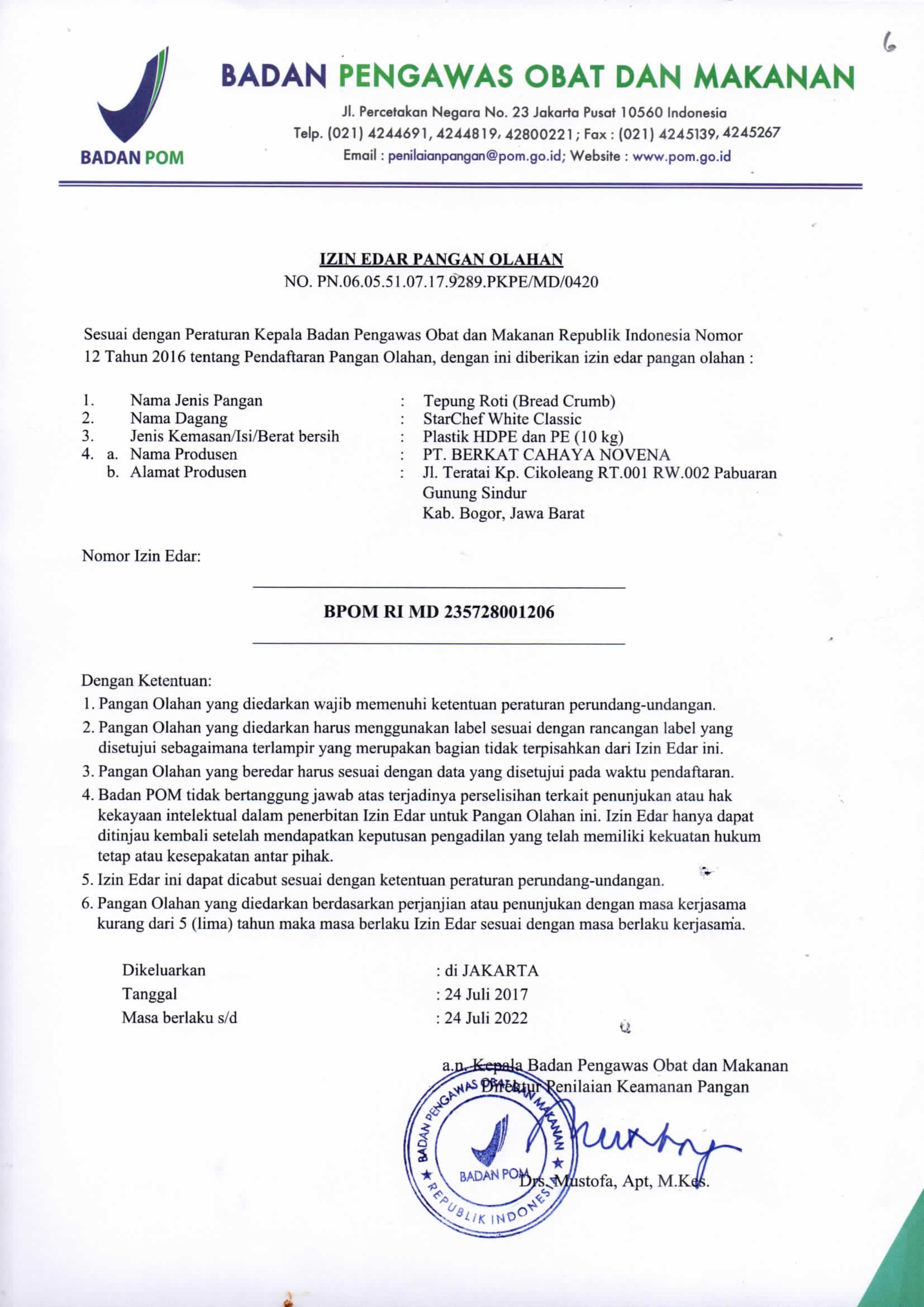 Tanggal 24 Juli 2017 untuk pertama kalinya keluar Ijin Edar Pangan Olahan dari BPOM RI untuk Breadcrumbs dengan nama dagang StarChef White Classic dengan Nomor Izin Edar: BPOM RI MD 235728001206. Setelah ini menyusul keluar No MD untuk nama-nama dagang yang lain.