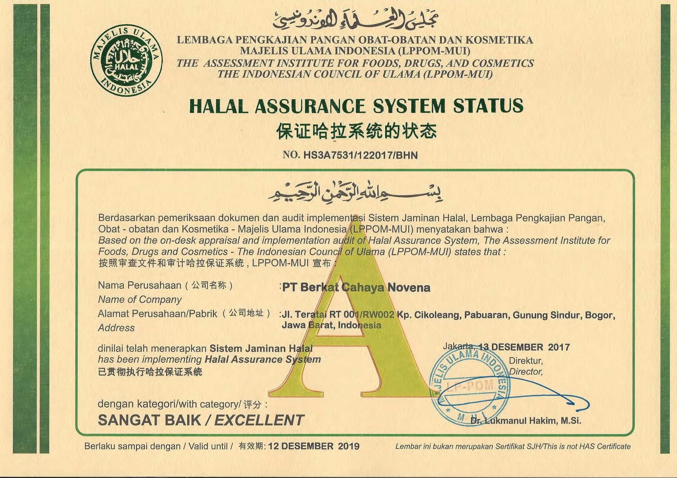 Pada tanggal 13 Desember 2017 kembali mendapatkan Sertifikat Sistem Jaminan Halal (SJH) dari LPPOM-MUI dengan nilai A: Sangat Baik/Excellent untuk yang kedua kalinya.