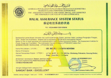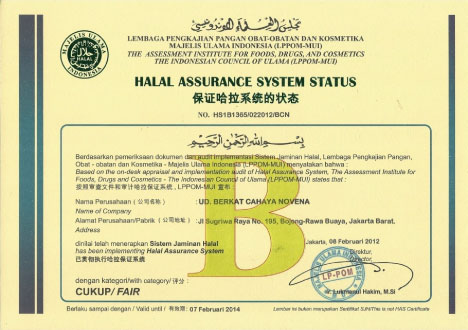 Mendapatkan Sertifikat Sistem Jaminan Halal (SJH) dari LPPOM - MUI pada tanggal: 8 Februari 2012.