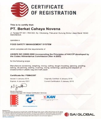 Setelah melewati persiapan secara menyeluruh, training, implementasi, serangkaian proses audit eksternal Audit Stage 1 dan Audit Stage 2, akhirnya PT. Berkat Cahaya Novena berhasil memperoleh Sertifikat Internasional mengenai Sistem Manajemen Keamanan Pangan ISO 22000:2005 dari Badan Sertifikasi SAI Global pada tanggal 5 Januari 2018.