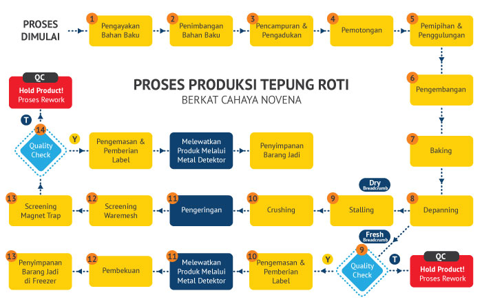 Upaya Berkat Cahaya Novena dalam menjaga standar mutu diterapkan secara menyeluruh sesuai persyaratan ISO 22000. Sebelum membeli bahan baku, kami melakukan seleksi pemasok yang ketat dan melakukan evaluasi pemasok secara berkala. Kami juga menerapkan sistem produksi yang baku dan sesuai standar. Karena dengan penerapan standar ini kami mampu meningkatkan efisiensi dan kualitas produk sehingga secara konsisten mampu menghasilkan tepung roti yang berkualitas dan bermutu tinggi.
